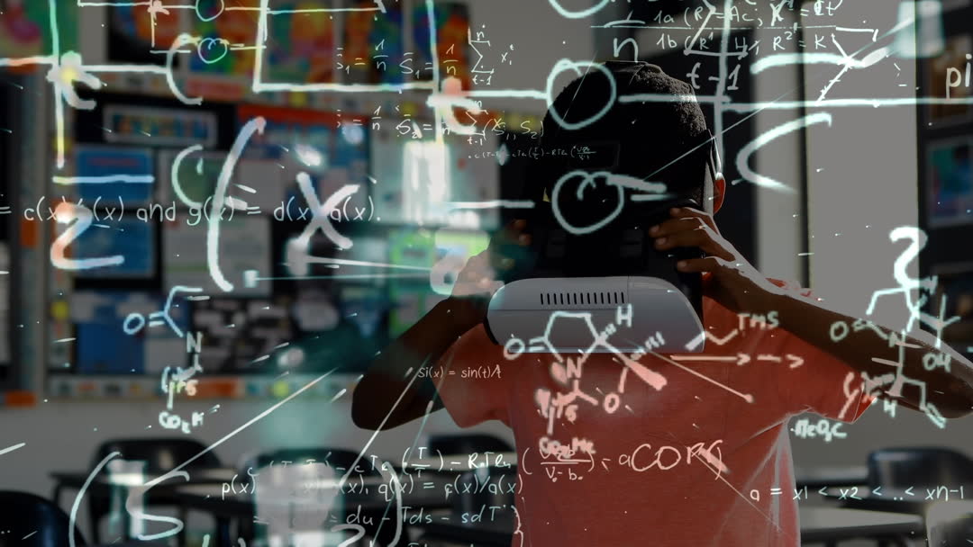 Schoolboy is in classroom using virtual reality headset with mathematical equations floating around. This illustrates the innovative use of technology in education, merging traditional learning with immersive experiences. Useful for promoting modern educational tools, illustrating STEM education advancements, or depicting future school environments.