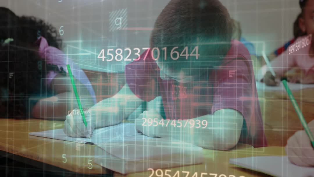 Young student focused on writing in a classroom setting. Futuristic digital grid with floating numbers symbolizes the integration of technology in modern education. Ideal for illustrating themes of innovative teaching methods, digital classroom environments, and education technology advancement.