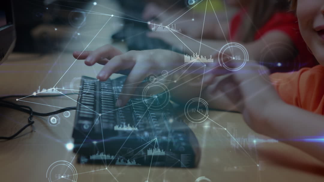 Schoolchildren hands typing on keyboards with overlay of digital network connections representing global education and technological learning. This visual highlights the integration of technology in modern classrooms, and is ideal for use in educational materials, technology promotions, and digital learning advertisements.