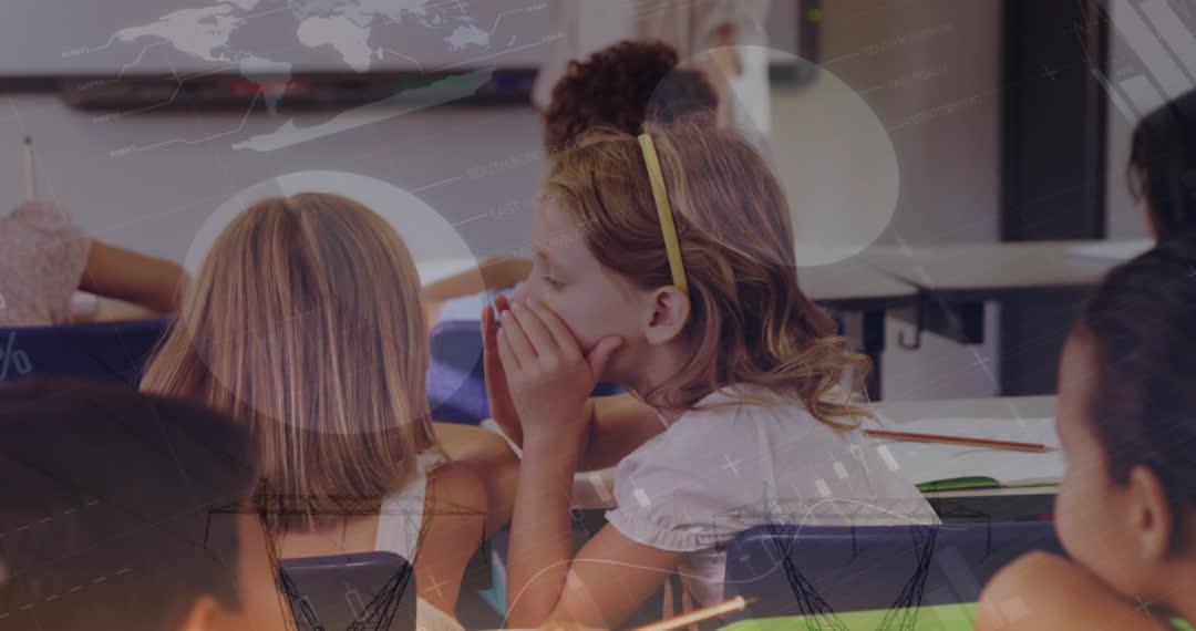 Playful video of schoolchildren whispering to each other, filled with a digital overlay of mathematical and global animations. This creates an intriguing juxtaposition between traditional learning environments and modern digital concepts. Perfect for educational content, emphasizing creativity, innovation in teaching methods, or illustrating conversations about technology-integrated courses.