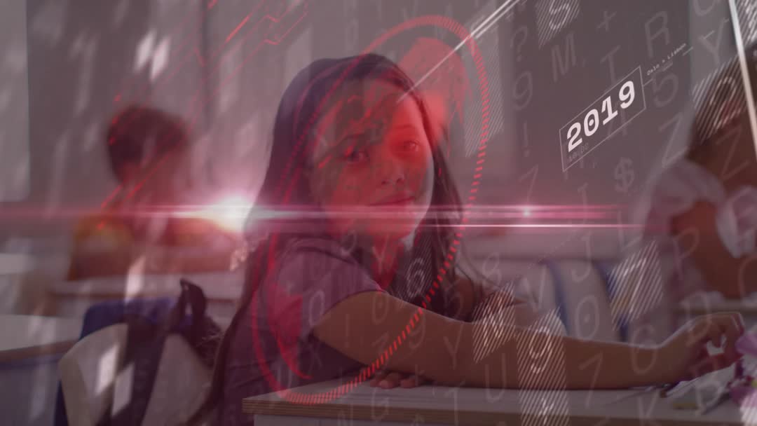 Schoolgirl Engaged in Learning with Digital Timeline Overlay Display Video