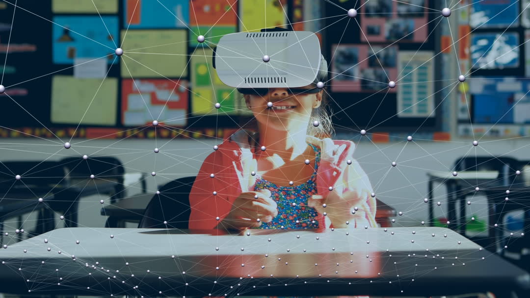 Schoolgirl is seated in a classroom exploring VR technology with a headset. Network connection overlay symbolizes digital interaction and futuristic learning. Perfect for illustrating innovative education, technology in schools, or virtual reality advancements in educational settings.