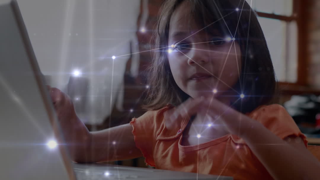 A young girl is captivated by a computer, depicted through an overlay of digital-style network connections illuminating her focus. This offers a futuristic glance into the seamless integration of technology within education, symbolizing youthful curiosity in the digital age. Ideal for content on educational technology, online learning, and the impact of digital transformation on young students.