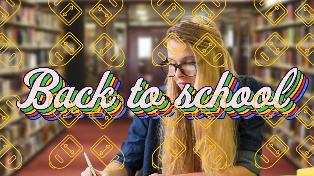 Graphic of teen girl studying in library with colorful back to school and backpack overlays. Great for back to school promotions, educational content, and student-focused marketing materials.