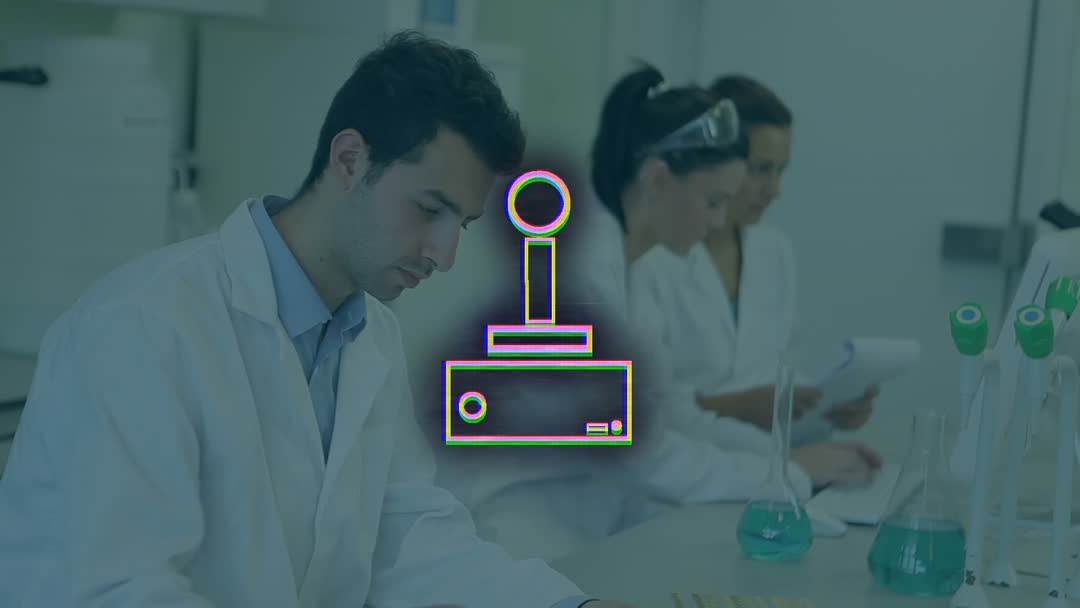Overlay of a futuristic game interface depicted by animated gamepad icon against backdrop of diverse scientists in lab coats focused on their experiments in laboratory. Animation symbolizes blending of science and digital gaming technology, ideal for content on technological advancements in science, gaming industry, or STEM education initiatives.