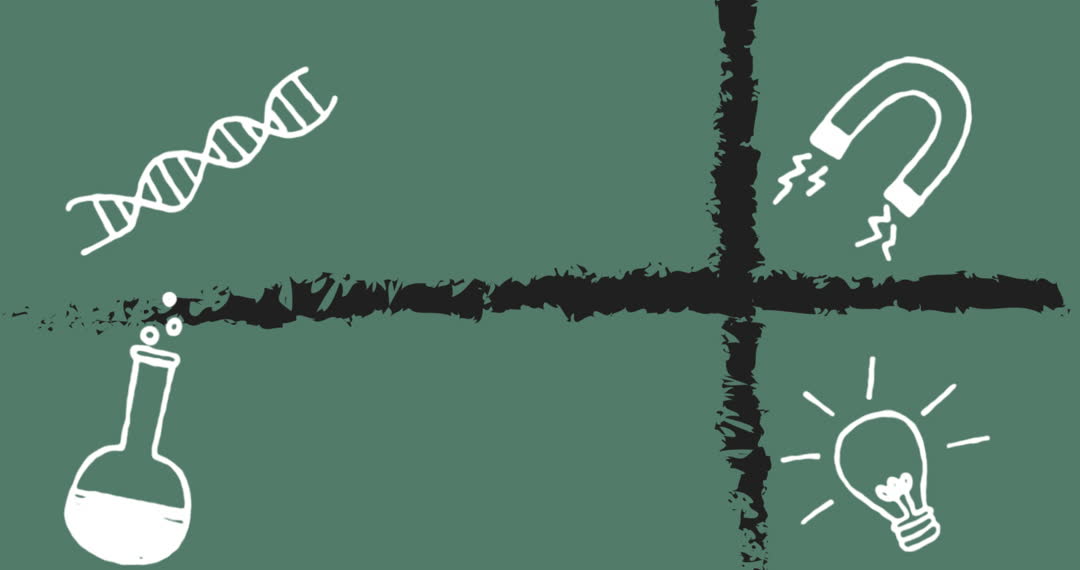 Illustration depicts essentials of science with DNA strand, magnet, lightbulb, and beaker sketched on green chalkboard style background. Useful for educational content, science presentations, classroom decor or promoting STEM initiatives. Symbolizes innovation, discovery, and curiosity exploratory themes.