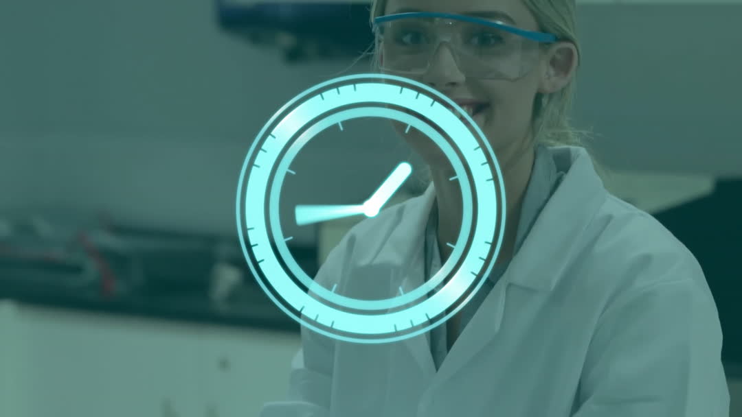 Features a female scientist in a lab setting with an animated clock overlaying as a visual representation of time management in research. Useful for illustrating science, experimentation, data collection, and laboratory process concepts.
