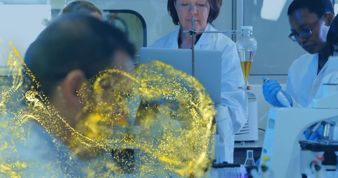 Female researchers in laboratory experimenting with pipettes and technologies like data visualization superimposed with golden particles. A robust environment showcasing team collaboration in scientific breakthrough, attractive for educational content or articles on innovative research methods, technology in science labs, or collaborative scientific projects.