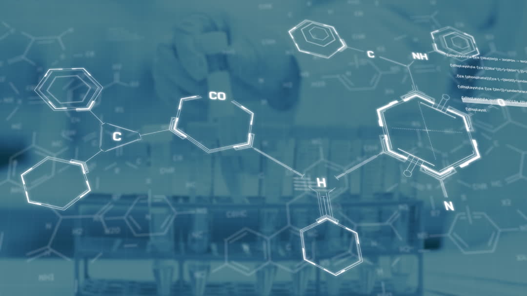 Shows diagrams of chemical structures overlaying scientific analysis space. Ideal for educational content, showcase research, convey high-tech theme for educational videos and scientific publications.