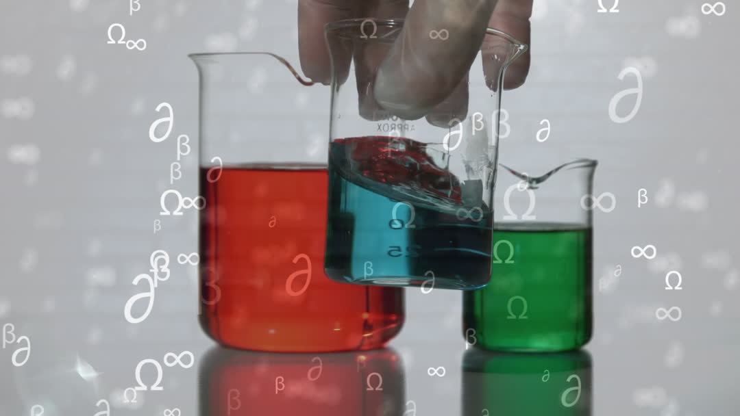Curious display of scientific beakers filled with colorful liquids against overlay of animated mathematical symbols. Ideal choice for illustrating concepts in science education, technology interfaces, or data visualization in digital presentations.