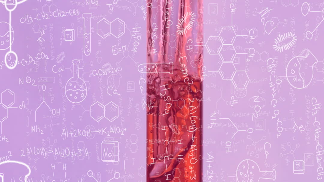Scientific animation showcasing chemical formulas and symbols over red liquid in a test tube. Ideal for educational materials in chemistry, presentations on scientific research, or visual content for laboratories highlighting techniques in molecular experiments.