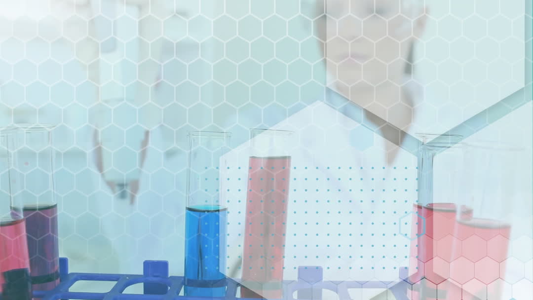 Foreground features lab setting with test tubes containing blue and pink liquids, indicating ongoing scientific experiment. Digital elements in hexagon patterns suggest a modern, tech-driven approach to scientific research. Depiction hinges on themes of innovation, research advancement, chemistry application, and laboratory analysis. Ideal for illustrating topics in scientific research development, technological integration in labs, and innovation in chemical sciences.