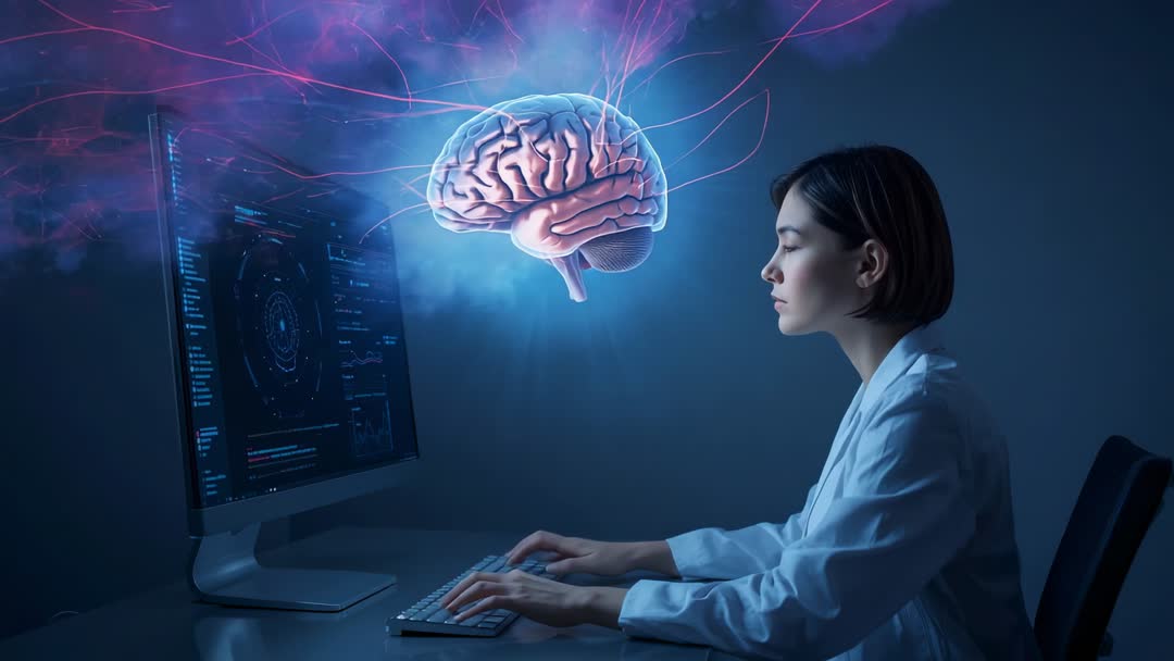 AI Generated Image. Scientist is working at a desk analyzing computer data while a 3D brain hologram materializes nearby, emphasizing concepts in neuroscience and artificial intelligence. This video is ideal for demonstrating innovation in AI technology, illustrative scientific research applications, and advanced data visualization methods. Perfect for educational materials, tech keynote presentations, and resources on cutting-edge technology research.
