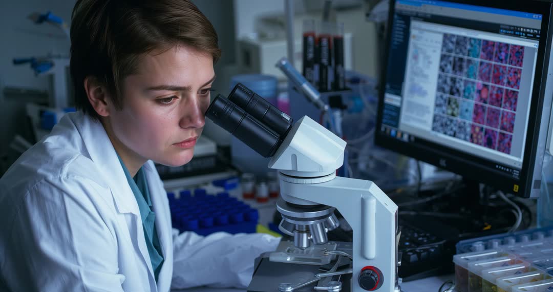 AI Generated Image. This visual captures the essence of laboratory research, featuring a scientist deeply focussed on looking at samples under a microscope while referencing data on a computer screen. Ideal for use in media related to scientific research, diagnostic exploration, educational content on biology, or representing technological advancements in laboratories. Emphasizes the integration of manual science with modern computing, demonstrating investigational diligence in scientific studies.