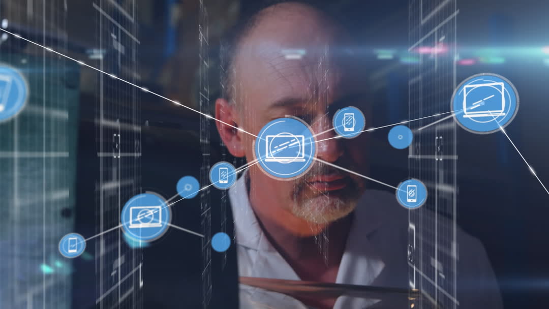 This visual innovation presents a senior male scientist immersed in analyzing technology and digital network connections. The videory offers a cross-hatched screen layered with technology icons symbolizing connectivity and scientific advancement. Suitable for exploring themes of scientific research, technological growth, or communication networks in presentations or articles.