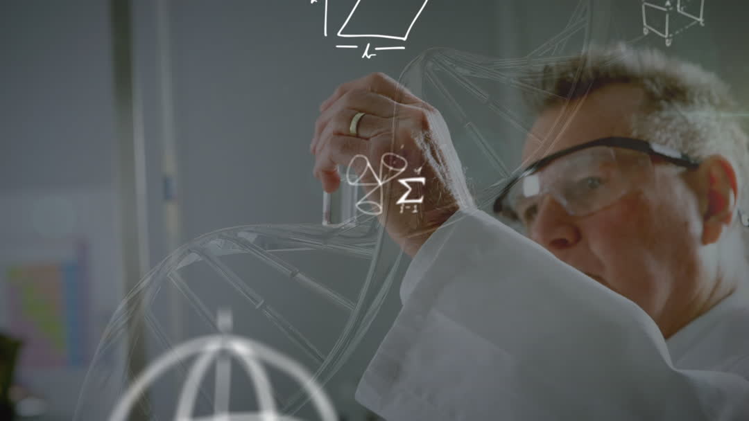 Scientist with glasses holding test tube, absorbed in analyzing a DNA model in laboratory setting. Complex calculations appear in forefront, emphasizing science and innovation. Suitable for use in articles or media about scientific research, advancements in medicine, and biotechnology innovations.