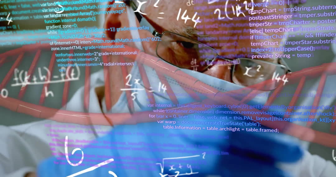 Caucasian male scientist wearing safety gear and analyzing DNA sequences while overlaid with abstract data-processing code in vibrant colors. Represents cutting-edge research, technological advancements in genetics, and artificial intelligence in scientific study. Ideal for use in educational content, tech research presentations, biotech marketing, and articles on scientific innovation.