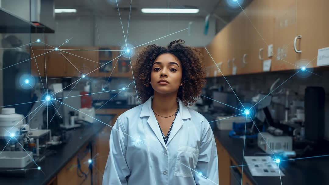 AI Generated Image. Young female scientist stands in a modern laboratory while a holographic network of data seems to emerge around her. Demonstrating innovations in data analysis within labs, the spectacle represents cutting-edge technology and artificial intelligence in scientific research. Ideal for content related to scientific discovery, technology integration in labs, digital transformation in biology, and promoting STEM fields.
