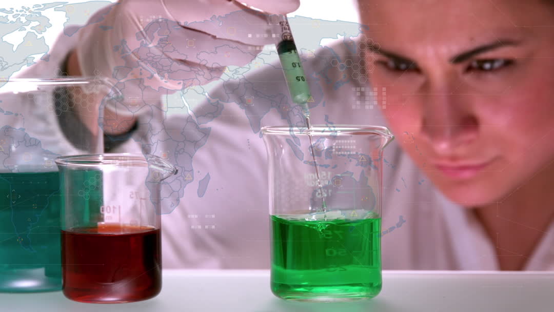 Female scientist focusing on liquids in beakers in a laboratory setting, paired with data and world map animations. Image perfect for showcasing innovations in scientific research, chemistry experiments, or global collaborations in the sciences.