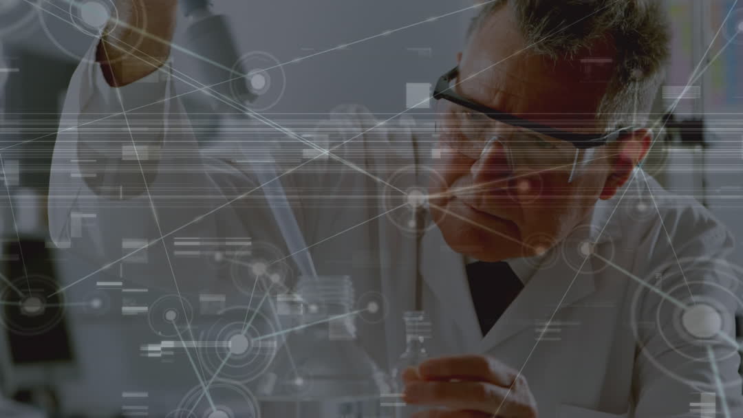 Caucasian male scientist focusing on a scientific experiment, with an overlay showcasing network connections to represent digital data and technological processing. Ideal for illustrating themes of scientific research, innovation, technology interaction, and modern laboratory work.