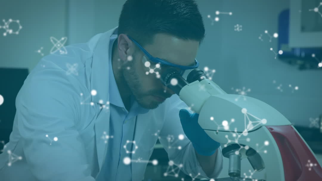 Scientist engaging intensely in examination using high-powered microscope in laboratory setup. Blending technology with research, illustrating complex molecular animation overlay. Suitable for illustrating modern advancements in science, education, and health-related innovations, highlighting exploration and curiosity.