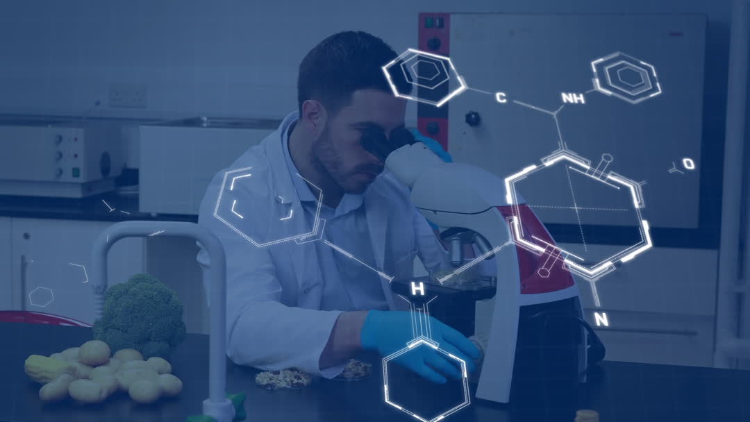Scientist wearing a lab coat and gloves observes samples through a microscope in a modern lab. Overlaid digital chemical formula diagrams illustrate the incorporation of advanced technology in research. Useful for depicting innovation in food science, biotechnology, and data-driven experiments. Suitable for illustrating advances in scientific fields and educational materials on laboratory practices.