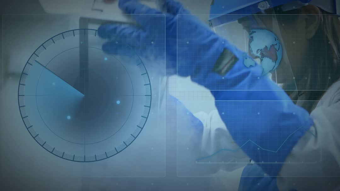 Lab researcher wearing protective gloves interacts with laboratory equipment, demonstrating cutting-edge scientific processes. The overlay includes radar and digital interfaces, highlighting technological precision and modern innovation. Useful for showcasing advancements in laboratory science, biotechnology, and digital tools in research environments.