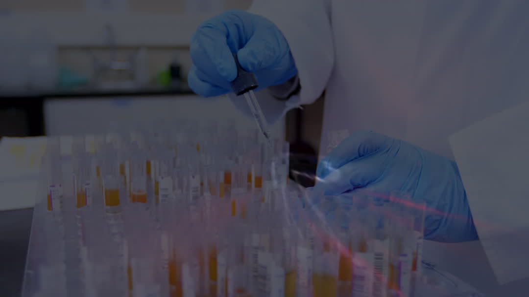 Scientific researcher conducting experiments in a laboratory while light trails add a high-tech digital effect. This video can be ideal for promoting technological advances, scientific discoveries, medical research, and innovation. Great for presentations and websites related to science and technology.