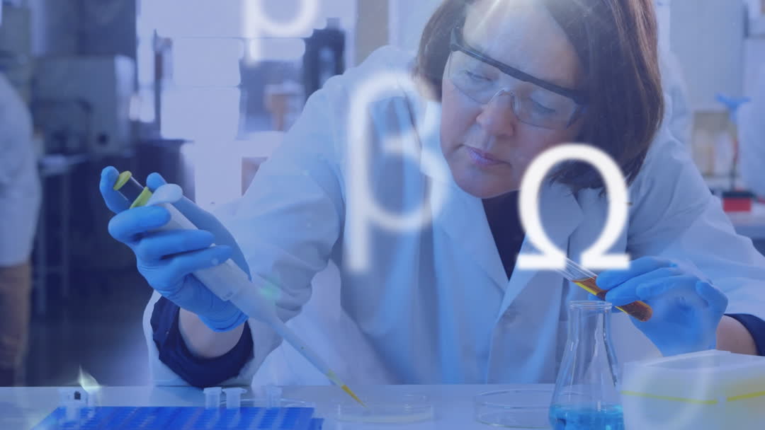A female scientist in a lab introduces liquid into a container with mathematical symbols overlayed. This video symbolizes the blend of scientific research and mathematical analysis, suitable for content related to innovations in science, education, laboratory work, or science communication.