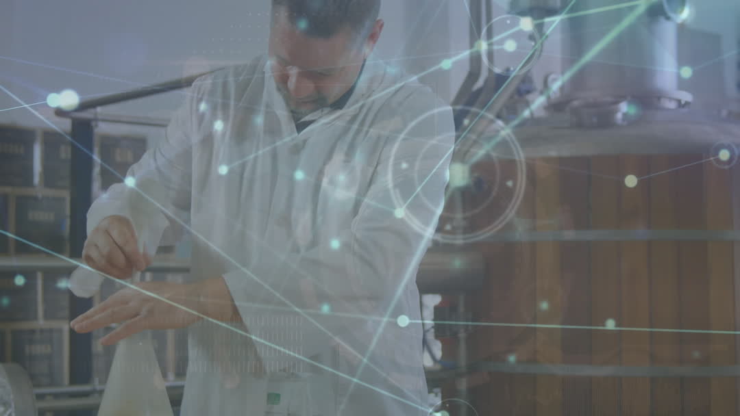 Worker in white lab coat stirring flask in factory environment with overlay of digital connections. Perfect for topics in data-driven processes, alcohol manufacturing, technological innovation in industry, or global scientific collaboration. Useful for illustrating intersection of science and industry.