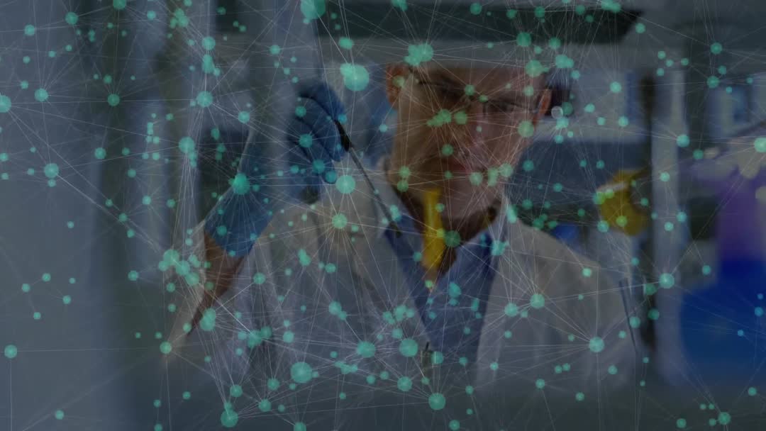 Scientist depicted processing experiment with pipette, associated with precision and innovative research. Utilized in contexts discussing scientific breakthroughs, lab technology advancements, and accurate experimentation techniques. Overlay of network data signifies cutting-edge research and technological integration in laboratory settings.