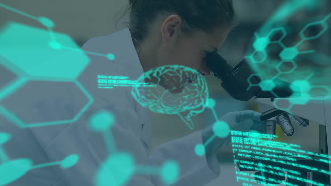 A female scientist uses a microscope in a modern laboratory with digital data overlays. Various data points and a brain graphic hover around, emphasizing themes of innovation, research, and technological advancement. Ideal for use in articles or multimedia on scientific research, tech integration in laboratories, or the future of data-driven exploration.