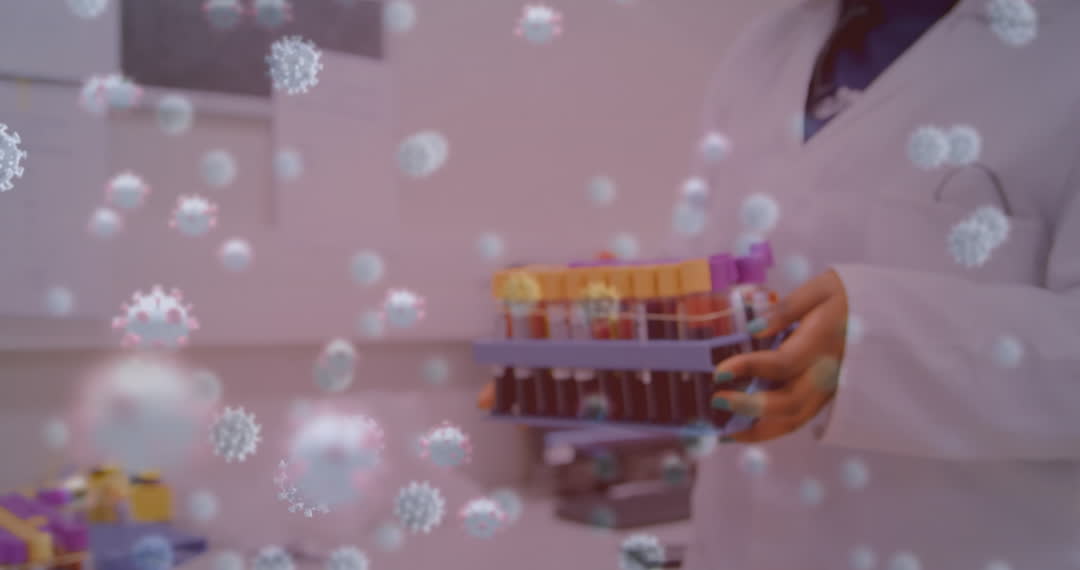 A scientist wearing a lab coat holds a rack of test tubes amidst digital animation of virus cells. This vibrant depiction epitomizes science and laboratory work, presenting a modern view of biomedical research with a focus on viruses. Ideal for illustrating scientific presentations, educational materials, health-related articles, and biotechnology innovations.