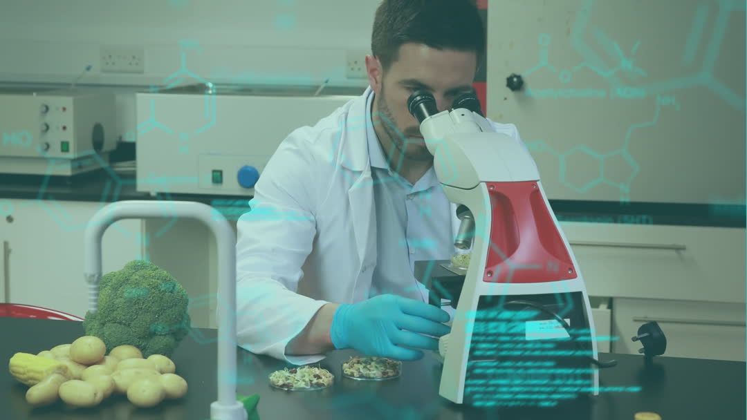 A male scientist in a laboratory peers through a microscope, surrounded by fresh produce samples such as broccoli and potatoes. The overlay of animated data holistically complements the advanced research scene. This can be used in contexts related to innovative research in the fields of microbiology, agriculture, and biomedical technology.