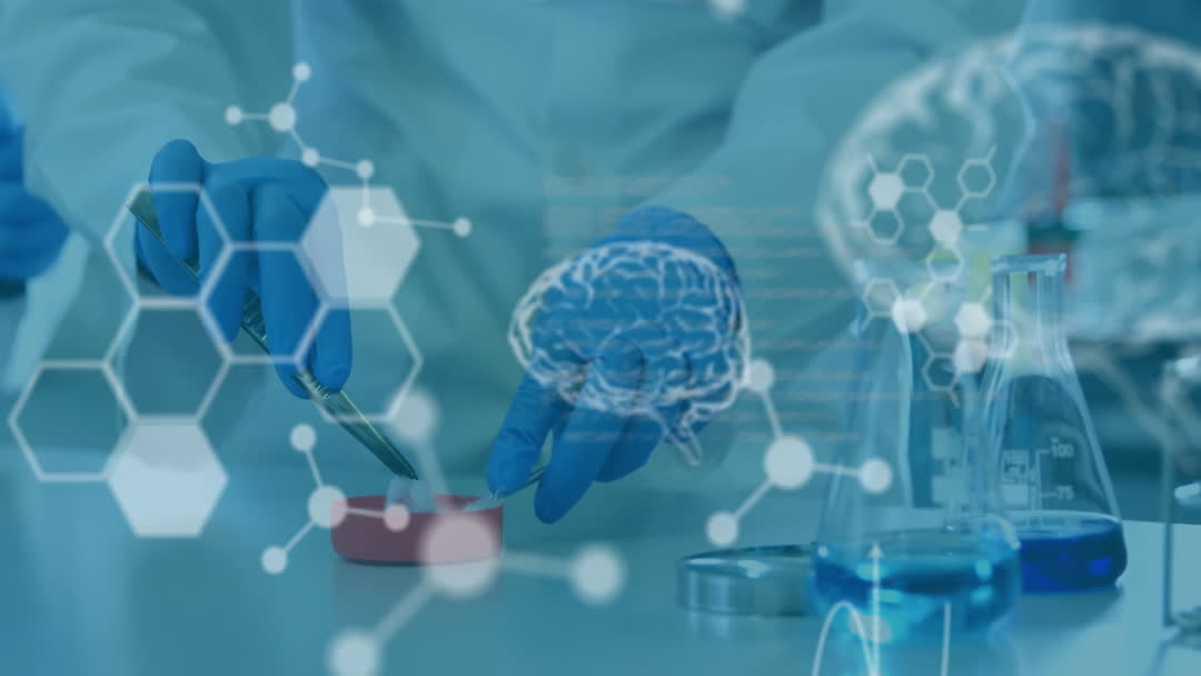 The scientist wearing blue gloves is interacting with research materials in a laboratory setting, including a petri dish, under a digital overlay featuring molecular structures and brain graphics, illustrating the integration of technology and research. This can be used in biotechnology articles, scientific presentations, and educational materials highlighting advancements in scientific fields and data processing.