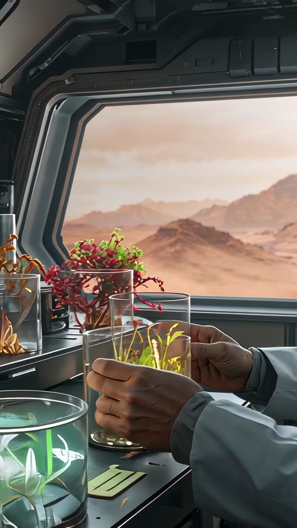 AI Generated Video. Showing researcher wearing lab coat handling rotating glass terrarium inside spacecraft cabin while rugged desert planet drifting outside window. Featuring close-up of hands adjusting delicate seedlings and monitoring bioluminescent growth inside clear cylinders with additional experimental samples on bench. Emphasizing tactile interaction, glass reflections, soft cabin lighting, and distant Mars-like mountain silhouettes for strong visual contrast. Suiting educational and promotional content for space botany, microgravity research, controlled environment agriculture, and biotech or aerospace branding. Serving as vertical social media reel, documentary clip, cinematic B-roll for science fiction projects, or background for startup pitch and investor presentation about sustainable food systems. Working well as insert shot for procedural tutorials, lab safety demonstrations, and immersive VR or AR experiences. Suggesting edit approaches: using slow push-in and gentle rack focus to enhance drama; isolating close-up details of roots and bioluminescence for cutaway sequences; color grading to balance warm cabin tones with muted orange exterior. Recommending ambient low-frequency hum and minimal melodic underscore for mood. Tagging metadata with terrarium, bioluminescent plants, microgravity experiments, spacecraft lab, in-orbit agriculture, hands-on research to improve discoverability.