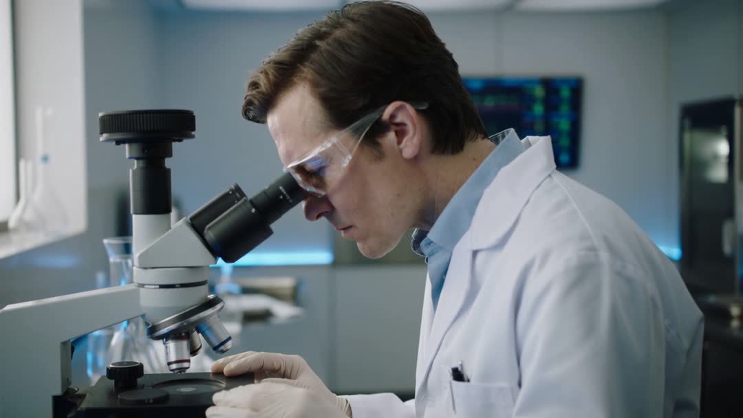 AI Generated Video. Showing male scientist wearing lab coat, safety goggles and protective gloves while peering through compound microscope and placing glass slide for focused sample analysis. Capturing close-up of microscopy workflow and methodical sample preparation, highlighting precision, concentration and instrumentation common in biomedical and pharmaceutical research. Suiting educational tutorials, laboratory training modules, corporate R and D presentations, medical marketing campaigns, news segments and documentary sequences about science and innovation. Providing clean, clinical visuals for use as B-roll, hero footage, background for voice-over explaining protocols, or cutaway for articles about diagnostics, lab safety and microscopy techniques. Suggesting color grade toward cool tones, add lower-third title and animated data overlays to emphasize research findings and technical details.