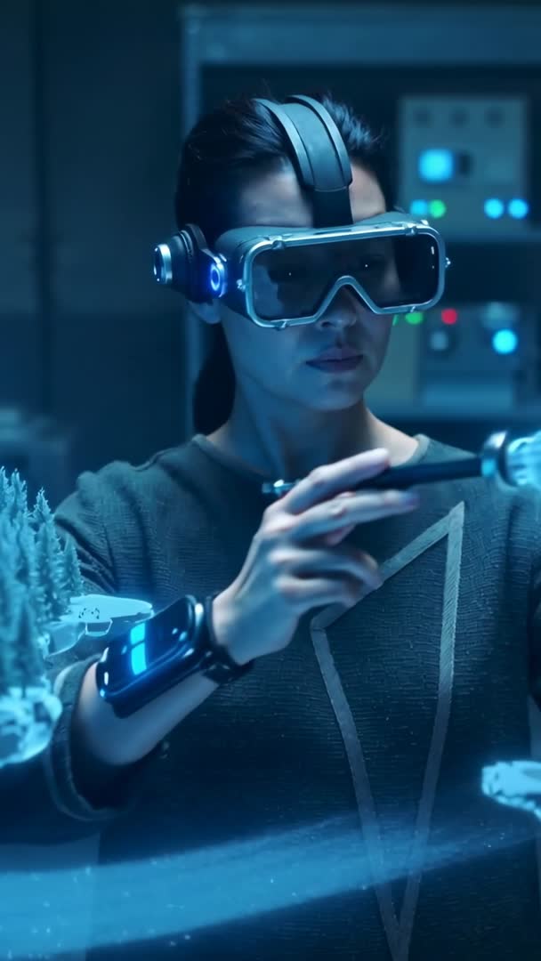 AI Generated Image. Vertical video showing woman using AR headset and holographic stylus while shaping 3D terrain and island models inside laboratory. Close-up framing emphasizing focused expression and precise gesture control, with glowing wrist wearable projecting interactive map overlays and spatial layers. Blue cinematic lighting creating futuristic mood and high-tech contrast, useful for narrative sequences and product demos. Use ideas: promotional clip for AR and MR platforms, demo reel for wearable tech startups, vertical social media ad for product launch, educational snippet for GIS and 3D modeling courses, background visual for presentations on digital twin and spatial computing. Editing tips: include slow motion cuts, subtle UI pop animations, and ambient synth sound design to enhance immersion. License-friendly visual suitable for commercial, editorial, and corporate technology storytelling.