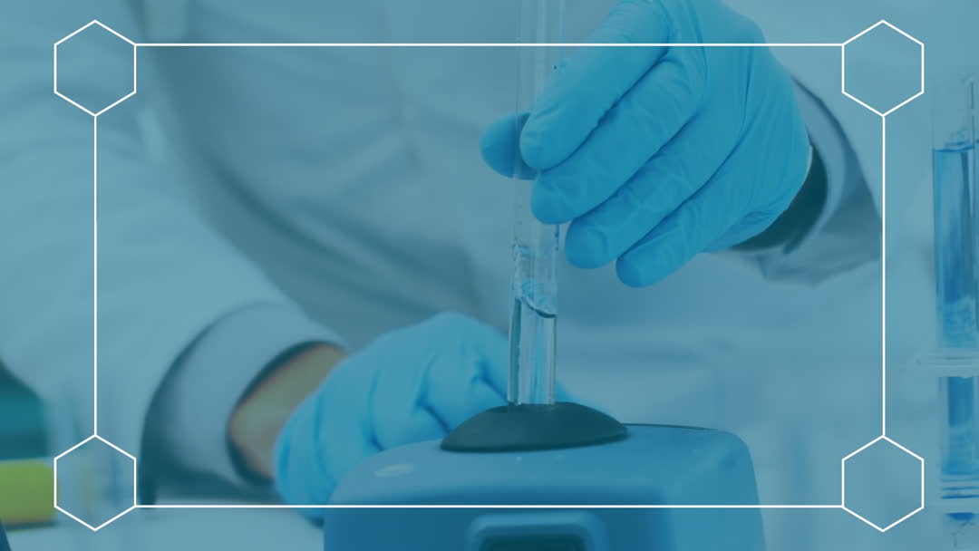 Scientist wearing blue gloves carefully stirs liquid in a test tube, representing laboratory work in a clinical setting. Hexagonal graphics overlay suggests innovation and technology. Useful for presentations on scientific research, biotechnology developments, or educational purposes in science modules. Highlights work in chemistry, pharmacology, and scientific investigation.