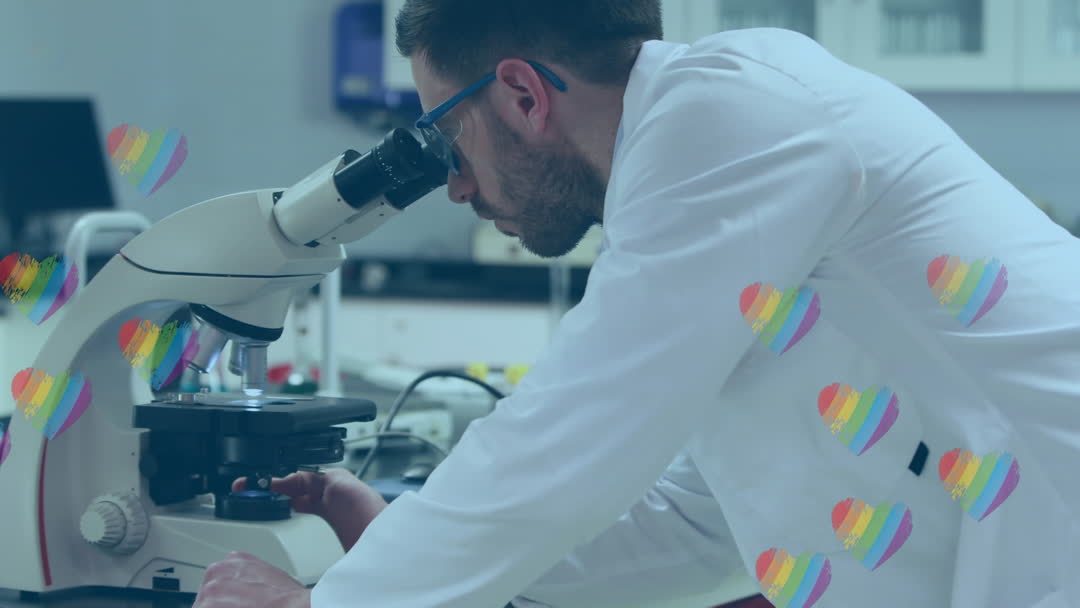 - Scientist Using Microscope in Laboratory with Rainbow Heart Overlay