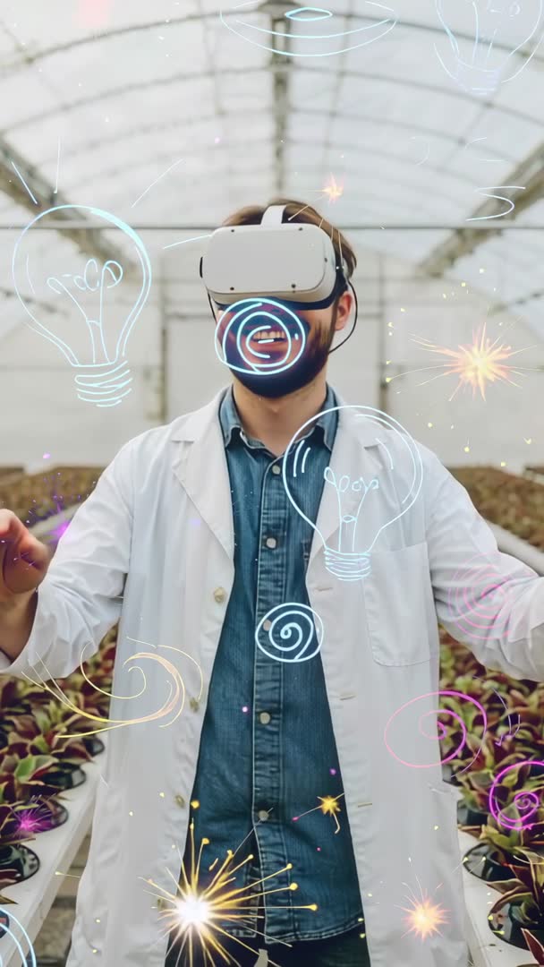 AI Generated Image. Showcasing scientist wearing VR headset and lab coat interacting with floating virtual light bulb inside greenhouse. Scene blending real plants with animated overlays, spark effects, and swirling icons, conveying innovation, futurism, and sustainable agriculture. Vertical video format designed for mobile-first platforms and social feeds. Use for agritech startup promos, technology demonstration reels, investor pitch videos, conference openers, e-learning modules, and sustainability campaign content. Clip working well as hero shot for website banners, short social ads for Instagram Reels or TikTok, and editorial segments on future farming. Edit-friendly footage for cutting between close-ups on VR interaction and wider greenhouse views; color overlays adding energetic motion for thumbnails and vertical advertisements.