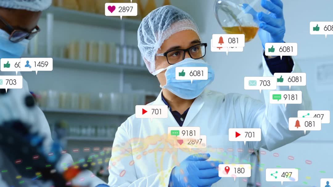 Researchers in laboratory carefully study an amber sample, highlighted by a unique overlay of animated engagement icons typically seen on social media. This combination of scientific analysis and digital metrics suggests a merging of disciplines, pointing to the importance of data in contemporary research environments. Useful for articles on innovation, interdisciplinary studies, science and technology advancement, or discussions of how digital tools are transforming research methodologies.