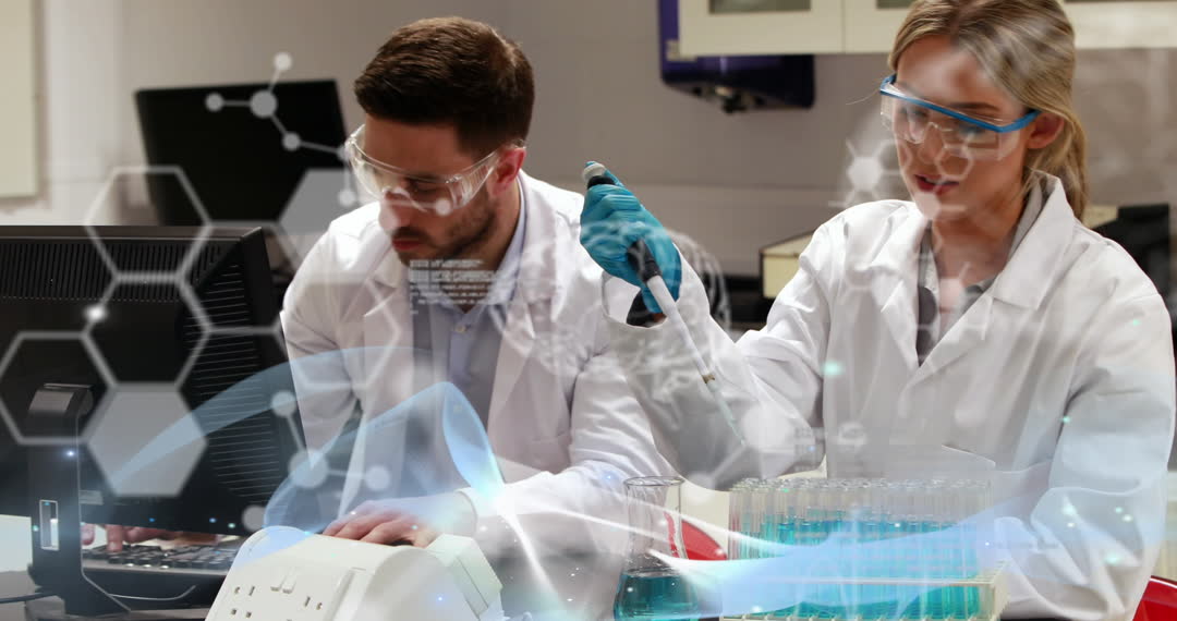 Researchers in white lab coats engage in scientific analysis, represented with a digital overlay indicating data and innovation. This dynamic and futuristic setup makes the scene ideal for use in technology and scientific presentations, educational materials, or articles focusing on laboratory advancements and teamwork in science.