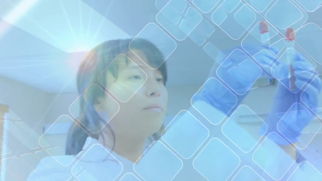 Scene captures focused scientist inspecting sample tube under light, representing teamwork and innovation in the laboratory. Perfect for showcasing research settings, promoting teamwork in scientific work, and illustrating modern techniques in biotechnology and lab environments.