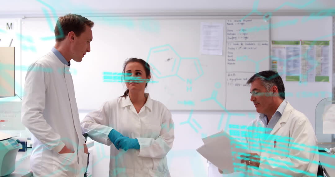 Three scientists, two men and one woman, stand in a laboratory while reviewing paperwork. They are dressed in lab coats, conveying a professional research environment. A futuristic animation of data processing has been overlaid on the scene, highlighting the convergence of traditional science with digital technology. This can be a perfect choice for representing modern scientific research, innovation in biotechnology, or teamwork in a healthcare setting.