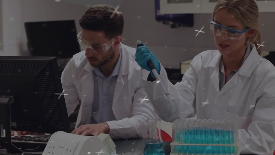 Scientists preparing samples using pipette while colleague entering data on computer Video