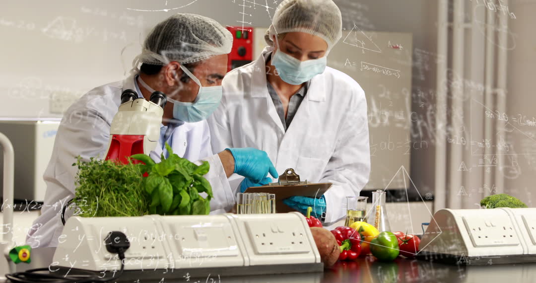 Scientists are working together in a laboratory environment, performing tests on fresh produce to ensure food safety and quality. They are wearing lab coats, masks, and hairnets for hygiene and protection. The presence of mathematical formulas overlay suggests a connection between scientific research and technological innovation. This scene is ideal for illustrating concepts related to food science, safety standards, scientific research advancements, and educational materials in science and technology.