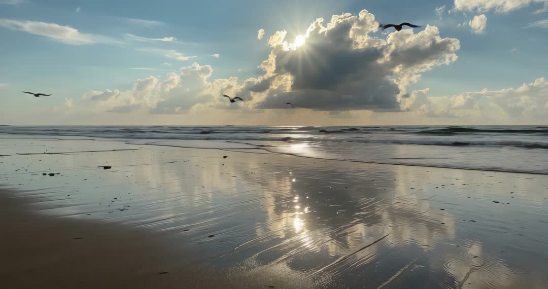 AI Generated Video. The scene shows seagulls gliding gracefully over the ocean as the sunlight sparkles on the mirror-like surface of wet sand. The towering cumulus clouds are lit elegantly by the rising sun, contributing to the peaceful, reflective ambiance. This video captures the serene beauty of a coastal morning, providing a moment of tranquility in a natural environment, suitable for projects highlighting nature, beauty, and peaceful moments.