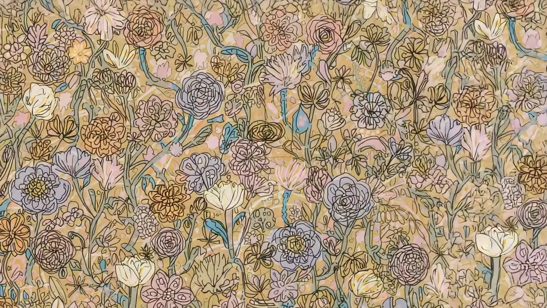 AI Generated Image. This video segment features a looping pattern of stylized, hand-drawn floral designs. Delicate rose-like blooms and daisies are artistically arranged, showcasing intricate details and subtle coloring. Ideally used as a decorative design, this seamless loop fits perfectly for textiles, wallpaper, or artistic explorations.