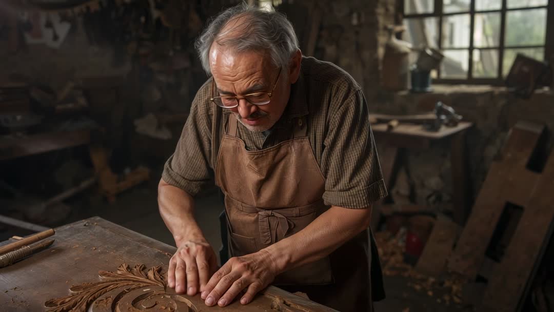 - Seasoned Craftsman Carving Ornate Wood Panel in Rustic Workshop Using Hand Tools
